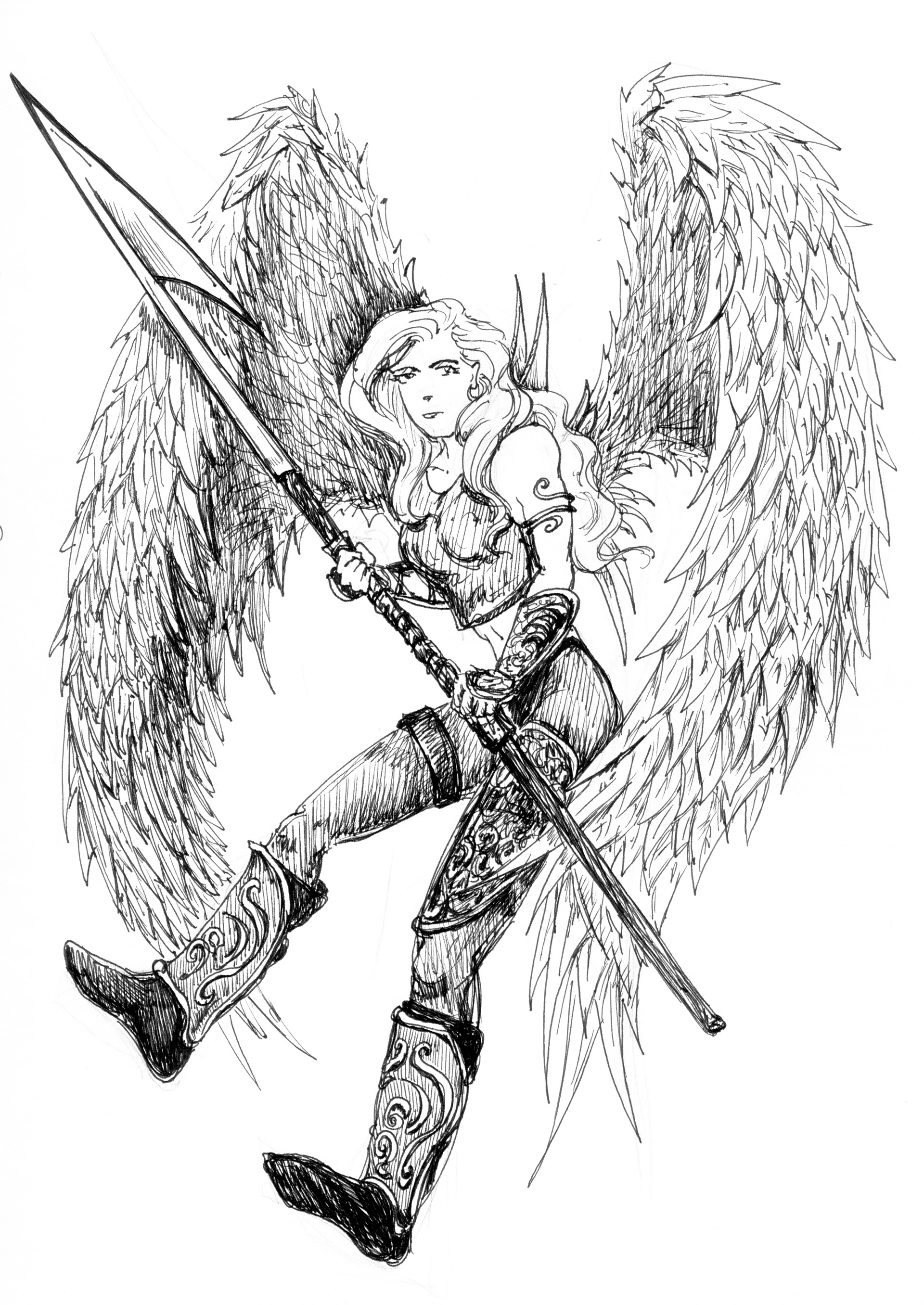 Pencil and Ink Drawing of Angel in Armor